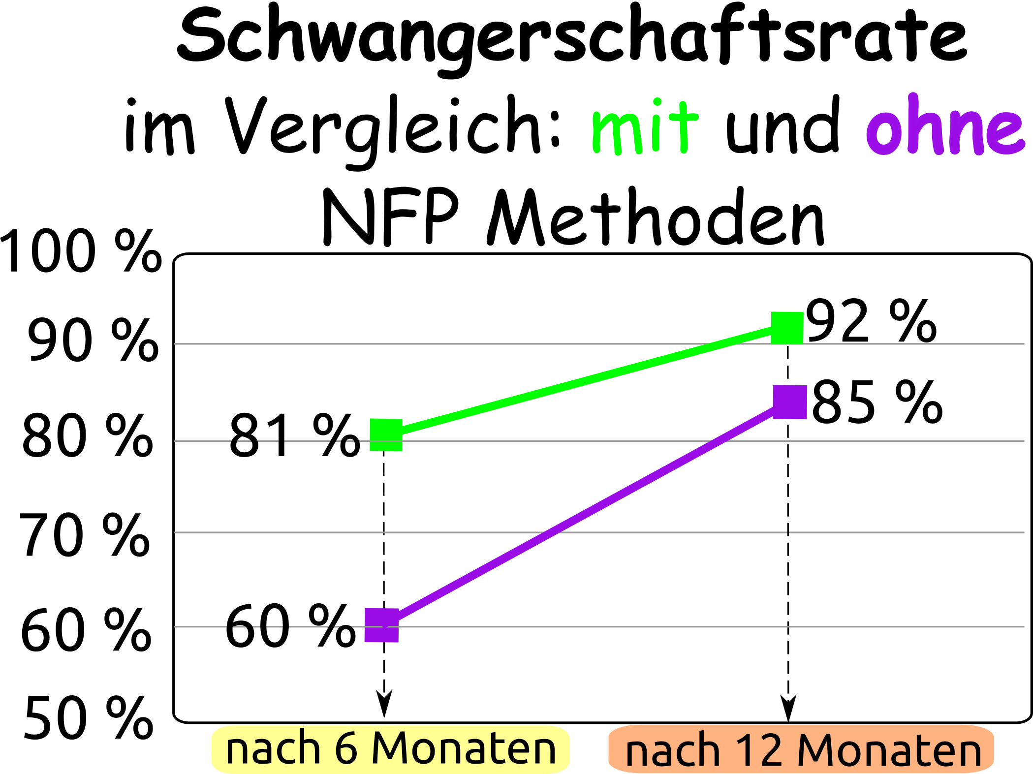 Kein Arzt und keine Methode können dir garantieren, dass du schwanger wirst, aber in einer Studie aus dem Jahr 2003 erreichte NFP (= Natürliche Familienplanung) eine Schwangerschaftsrate von 81% nach 6 Monaten und 92% nach 12 Monaten 📈🤰🏼🤩.